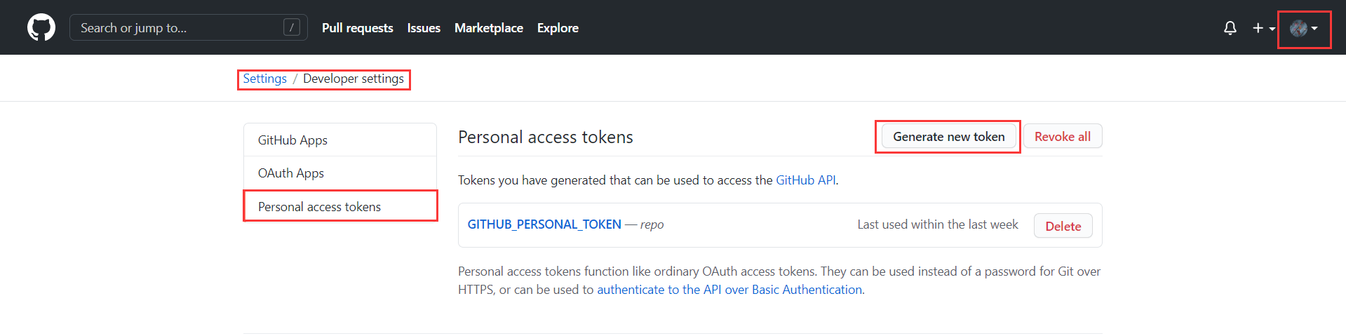 点击这里 【Github 官网】→【右上角头像】→【Settings】→【Developer Settings】→【Personal access tokens】 打开 Personal access tokens 设置项。