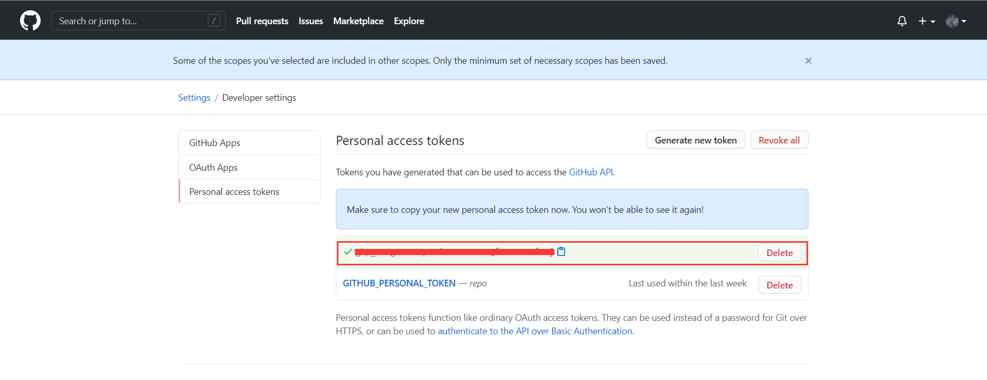 最后点击最下方的创建就可以生成自己的私人访问令牌啦,不过这个私人访问令牌只有创建的时候才会显示一次,后边是查看不了的,所以要注意记录下来。