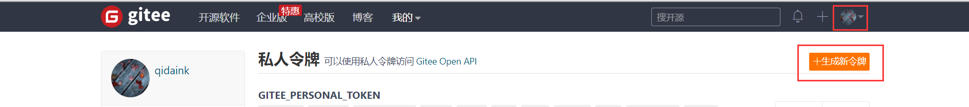 点击这里 【Gitee 官网】→【右上角头像】→【设置】→【私人令牌】,打开设置后下拉就可以找到【私人令牌】选项了,打开该设置项。