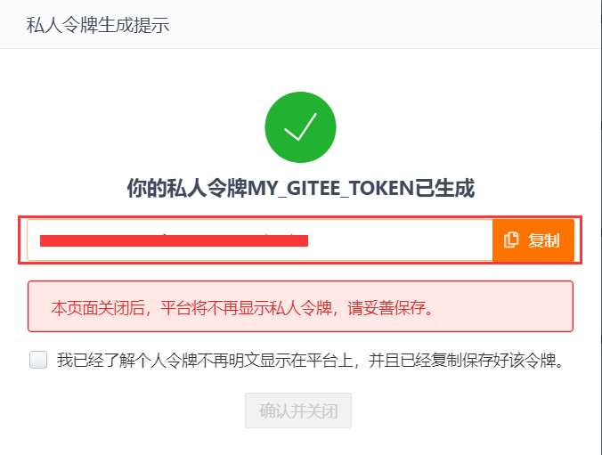 最后点击提交,然后输入登录密码进行验证即可生成自己的私人令牌,Gitee 的私人访问令牌也是只有创建的时候才会显示一次,后边是查看不了的,所以也要注意记录下来。